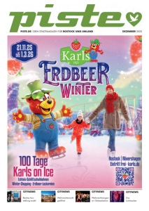 PISTE.DE I INHALT 003 INHALT p schon ist das Jahr zu Ende. Fix noch Advent, Weihnachten und Silvester. Aber halt. Der Dezember hat so vieles mehr zu bieten. Ein Beweis dafür hältst du in deinen Händen. Auch wenn wir mit 108 Seiten daher kommen, haben es trotzdem nicht alle spannenden Geschichten, Veranstaltungen oder Event/InstaFotos in die aktuelle Ausgabe geschafft. Bevor wir dir aber einen 200 Seiten Schmöker zumuten, haben wir eine bessere Lösung: Ich lege dir unsere Internetseite ans Herz. Nicht Facebook oder Insta, sondern unsere Präsenz im www. Dort findest du nicht nur von vielen Beiträgen weiterführende Infos, sondern auch viel mehr Termine und Veranstaltungen. Allein für das kommende Jahr haben wir schon über 50 Events online - und das beste: Die Tickets kannst du bequem gleich dort buchen. Auch bei den Event-Fotos schaffen es nur ein Bruchteil ins Heft, daher: Viel Spaß beim digitalen ansehen. Dazu gibt es aktuelle Neuigkeiten, Terminänderungen und und und. Als Ergänzung zum Analogen Heft der perfekte digitale Begleiter für dich. Komm uns doch mal besuchen. Ein Jahresabschluss wäre nicht komplett, wenn wir nicht von ganzem Herzen jedem einzelnen Anzeigenkunden Danken. Nur durch eure Unterstützung können wir monatlich ein buntes Stadtmagazin herausbringen. Von Rostockern mit Herz, aus Rostock für Rostock. Auch gedruckt wird seit 2025 in Rostock. So bleibt das Geld in der Region. Das ist uns nämlich ein Herzenswunsch. Ein frohes Fest und einen guten Rutsch im Namen des gesamten Teams wünscht dir Miss you❤❤❤ HALLO LIEBER LESER, CITYNEWS I 004 CITYNEWS I 008 CITYNEWS I 012 CITYNEWS I 025 CITYNEWS Neues aus Rostock . . . . . . . . . . . . . 004 Lifestyle . . . . . . . . . . . . . . . . . . . . . 038 Neues aus Güstrow . . . . . . . . . . . . . 042 Neues aus Bad Doberan . . . . . . . . . 046 Job & Ausbildung . . . . . . . . . . . . . . 050 KULTUR Bühne . . . . . . . . . . . . . . . . . . . . . . 056 Kino . . . . . . . . . . . . . . . . . . . . . . . . 058 Konzerte . . . . . . . . . . . . . . . . . . . . . 060 Gastro . . . . . . . . . . . . . . . . . . . . . . 064 BOULEVARD Branchenbuch . . . . . . . . . . . . . . . . 076 Impressum . . . . . . . . . . . . . . . . . . . 076 Terminkalender . . . . . . . . . . . . . . . 077 Event-Tipps . . . . . . . . . . . . . . . . . . . 079 Rätsel . . . . . . . . . . . . . . . . . . . . . . . 084 Kinderrätsel . . . . . . . . . . . . . . . . . . 087 Mosaik-Wimmelbild . . . . . . . . . . . . 088 AUF DER PISTE Instabilder . . . . . . . . . . . . . . . . . . . 090 Eventbilder . . . . . . . . . . . . . . . . . . . 094 Piste-Retro . . . . . . . . . . . . . . . . . . . 104 Piste-CU . . . . . . . . . . . . . . . . . . . . 106