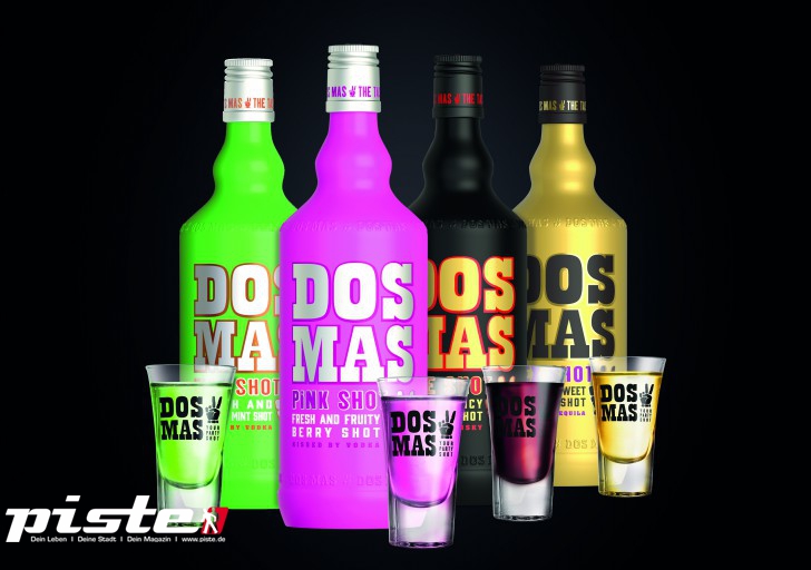 Anstoßen auf eine coole Nacht das geht am besten mit den bunten Partyshots der Marke DOS MAS. Ob frisch, fruchtig, süß oder feurig die Rezepturen begeistern gleichermaßen. Die vier unterschiedlichen Geschmacksprofile verheißen „Liebe auf den ersten Schluck“. Zimt liebhaber kommen mit den Sorten MEXSHOT (Zimtlikör mit Tequila )und FIRE SHOT (Zimtlikör mit Chili-und Whiskykick) voll auf ihre Kosten und erleben eine besonderes Geschmackserlebnis ob pur als Shot oder als Longdrink mit Maracujasaft oder Cola. DOS MAS PINK SHOT lässt als Berrymixlikör die pinkverliebten Herzen höher schlagen.