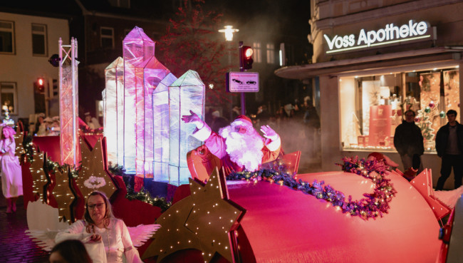 Auf dem glitzernden Wagen fährt der Weihnachtsmann mit und grüßt die Besucher entlang der Strecke über Marktplatz, Königstraße, Rosengarten, Plöner Straße, Albert-Mahlstedt Straße und Peterstraße.