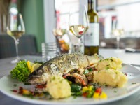 Moin Moin! im Restaurant am Strom! Das maritime Ambiente des Restaurants versinnbildlicht die Stimmung zwischen dem Alten Strom und dem Warnemünder Strand. Zugleich soll es ein authentisches, modernes Warnemünde wiederspiegeln. Die Strandbar zieren typische Klappbretter, welche die Ausstrahlung der Einrichtung zusätzlich unterstreichen. Der kulinarische Schwerpunkt des Lokals liegt auf Fischspezialitäten wie zum Beispiel Lachsfilet, Schlemmerfisch, Matjes oder Heilbutt. Falls euch nicht nach frischem Fisch sein sollte, könnt ihr auch Pasta, Salate oder Fleischgerichte genießen. Die Karte besteht aus saisonalen Gerichten und wird regelmäßig mit eigenen Kreationen des Chefkochs erneuert, die sowohl kreativ als auch traditionell sind. Ein besonderes Highlight ist auch der Blick von der Terrasse auf den Alten Strom mit seinen traditionellen Fischerbooten.